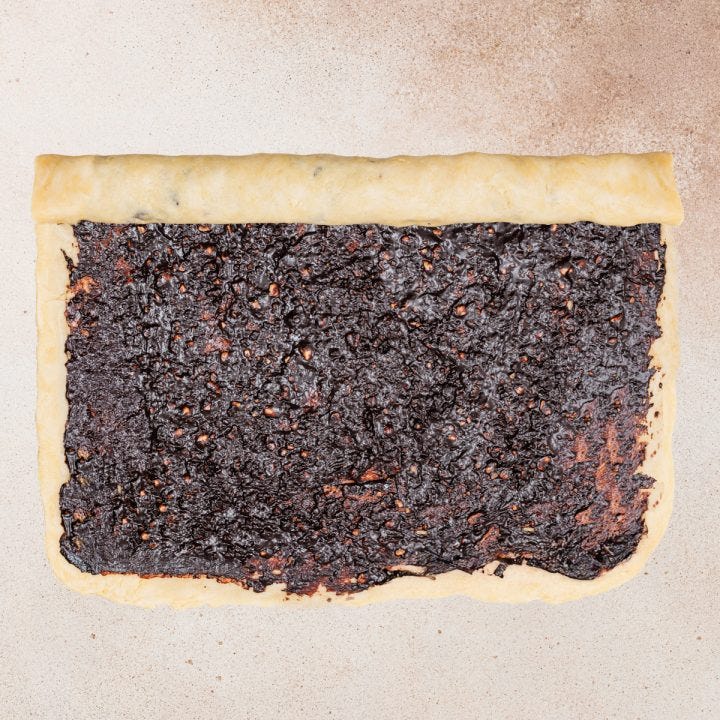 Spread the filling evenly over the dough. Roll it tightly into a log and then cut it lengthwise into two strips. Twist the two strips together, keeping the cut sides facing up.