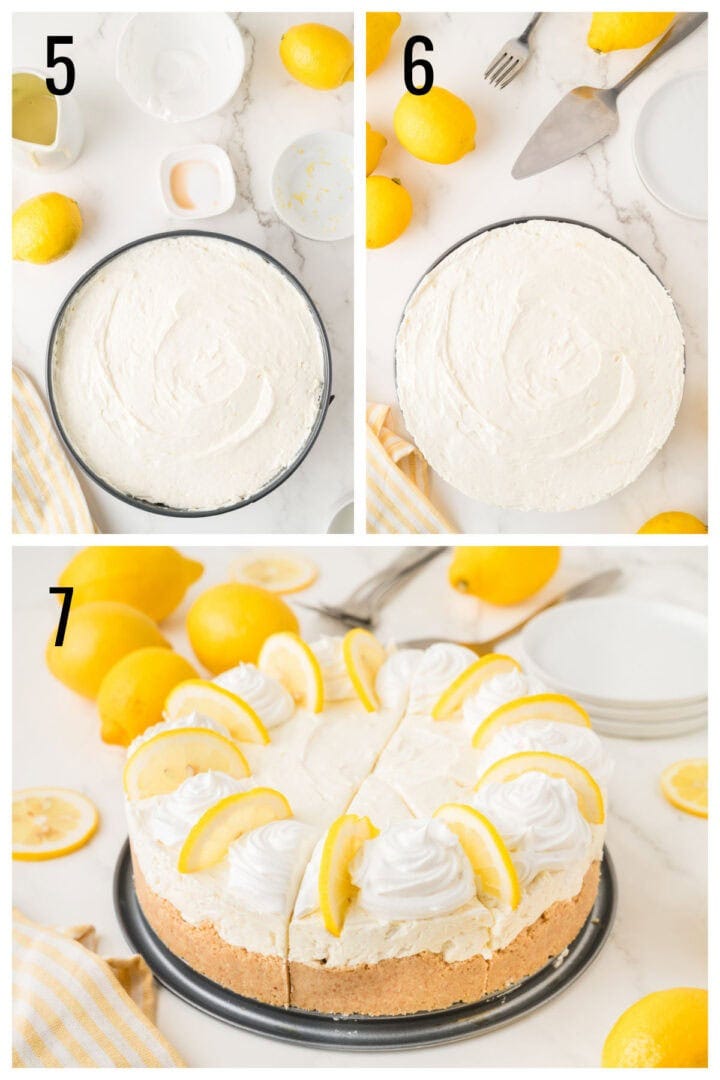 Once chilled and set, add the whipped cream, lemon slices, and more lemon zest if desired. Then slice, serve, and enjoy!
